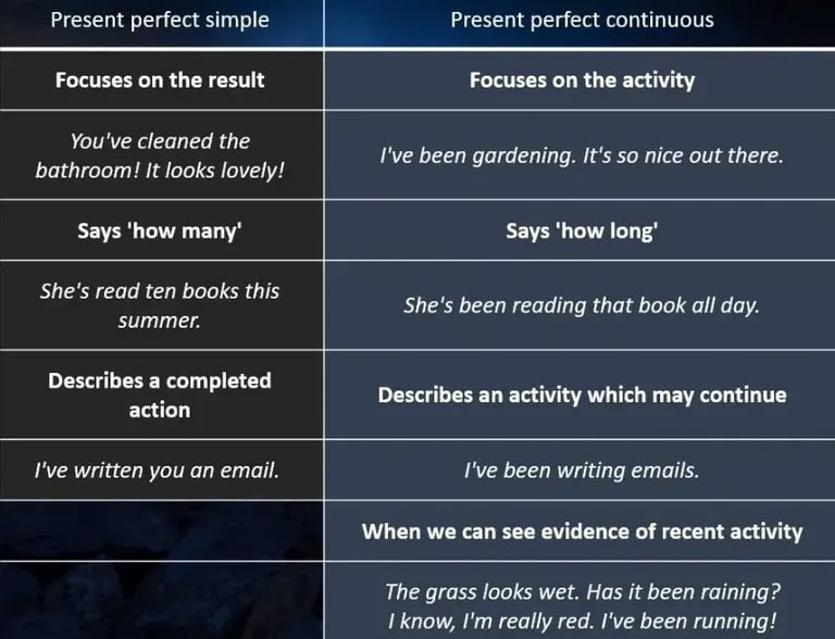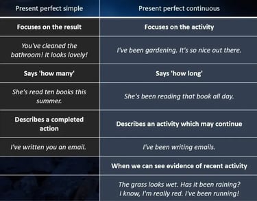 We use both the present perfect simple (have or has + past participle) and the present perfect continuous (have or has + been + -ing form) to talk about past actions or states which are still connected to the present.